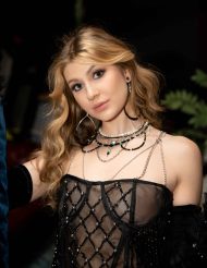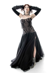 Introducing a vision of timeless elegance, behold this stunning black silk gown, meticulously crafted to captivate and enchant. Adorned with hand-beaded black glass beads meticulously arranged in a striking diamond pattern, the corseted bodice of this gown is a masterpiece of intricate detail. These lines artfully enhance the wearer’s figure, sculpting a silhouette of unparalleled grace and allure, while hand-sewn pearls delicately accentuate the outline of the hips, adding an extra touch of refinement and elegance. Adding to the allure, hand-beaded glass bead fringe and delicate chains gracefully cascade along the curve of the back, enhancing every movement with an air of sophistication and allure. Crafted from six layers of sumptuous black silk organza, the skirt boasts a slit that ascends daringly to the hip, revealing glimpses of skin with every step. Beneath, a short lace skirt adds a touch of romantic charm, balancing the gown’s modern edge with timeless femininity. Completing the ensemble, hand-beaded velvet gloves lend a touch of opulence and refinement, elevating the look to new heights of glamour and sophistication. With its exquisite craftsmanship and attention to detail, this black silk gown is a true statement piece, perfect for the woman who exudes confidence and style in every step she takes.